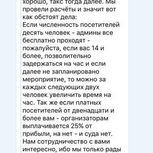 Добавила скрины переписки с вашим админом, чтобы условия были видны всем, а не только нам с вами. По итогам встречи: 10 человек прошли за полную стоимость, 11-й - администратор - мог пройти бесплатно. Но не прошел, не прошел...