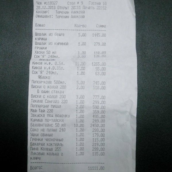Обслуживал официант Алексей. Утром глянул в чек и увидел позицию которую мы заказали - закуску под водку(495р) чтобы её употребить с алкоголем, но нужного нам алкоголя в наличии не оказалось и через минуту мы решили отказаться от закуски. Алексей понял и сказал что...